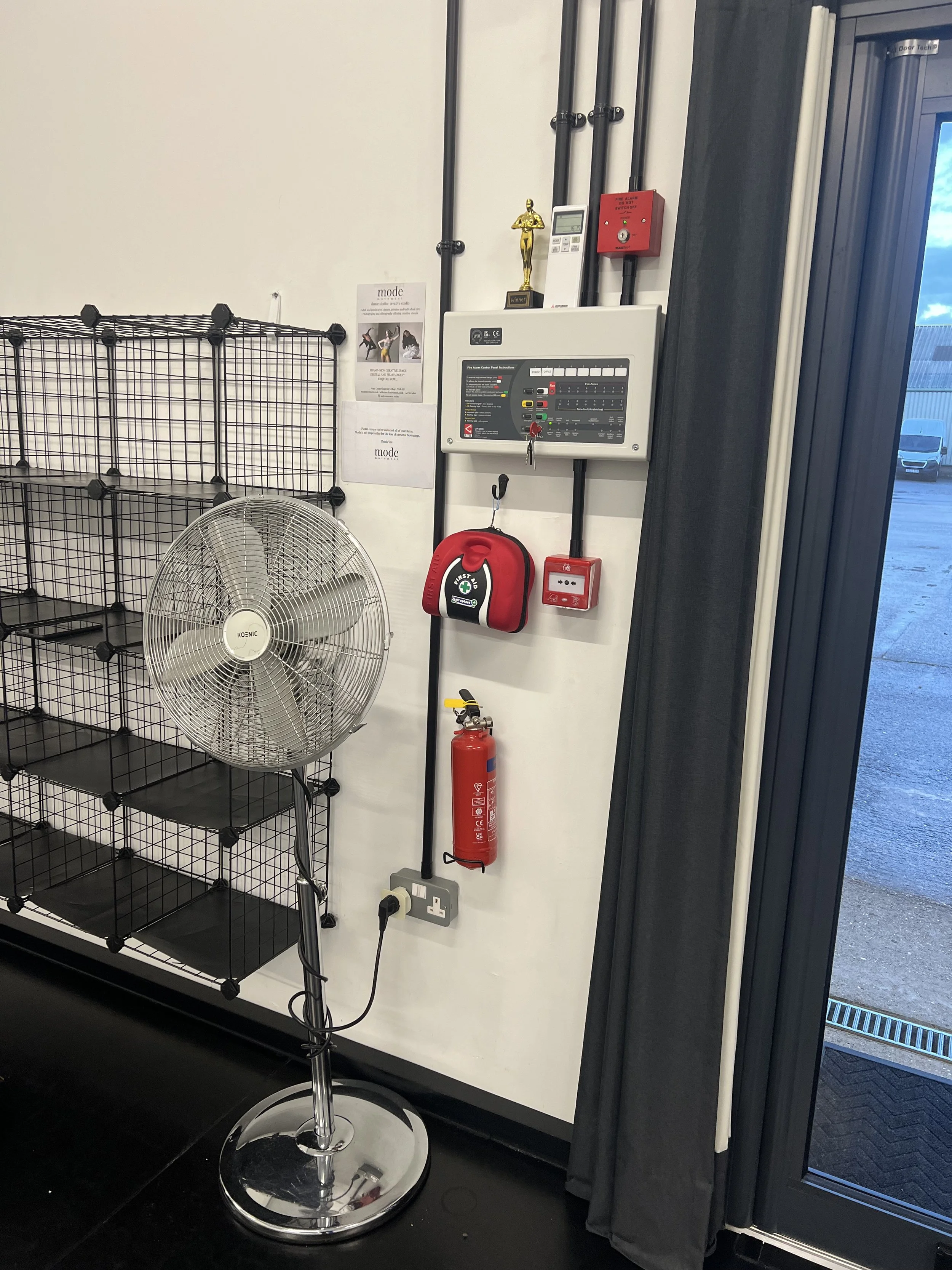 A fire extinguisher is located to the right of the main studio door — use only if it is safe to do so and you have been trained in its operation.