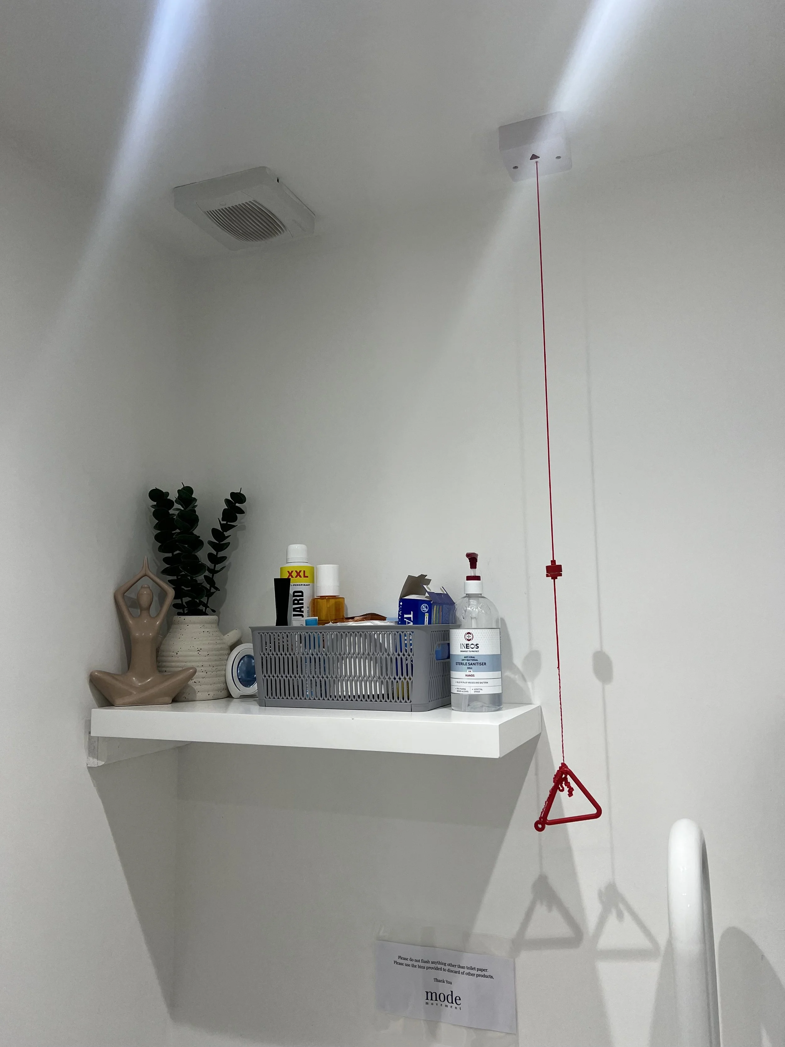 Bathroom Use: The bathroom is unisex and accessible. Use the emergency red pull cord if needed and reset using the red triangle button. Dispose of waste correctly using the provided general and sanitary bins. Do not flush anything except toilet paper. Contact mode movement if any bathroom issues arise.